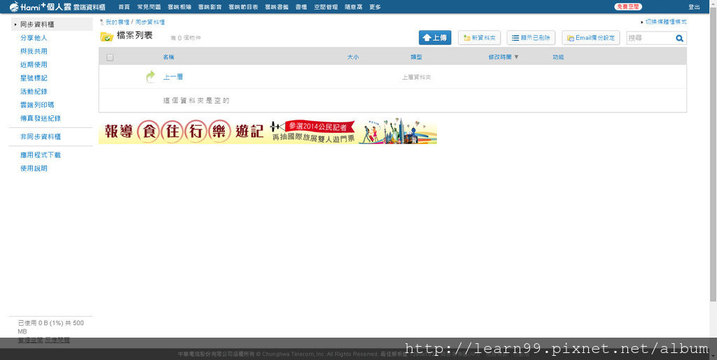 進入"雲端資料櫃"後的畫面如下,除了可以當雲端硬碟來用外,存在上面的文件、圖片資料更可在7-11的ibon進行雲端列印。